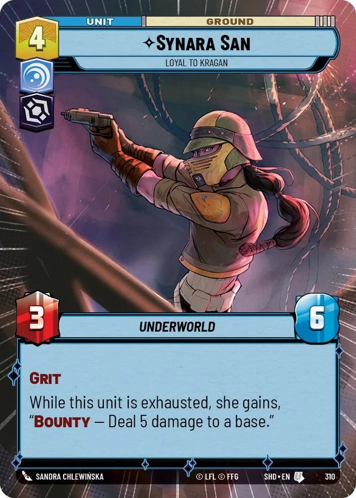 While this unit is exhausted, she gains, “Bounty — Deal 5 damage to a base.”