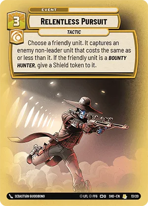 "Choose a friendly unit. It captures an enemy non-leader unit that costs the same as or less than it. If the friendly unit is a Bounty Hunter, give a Shield token to it."