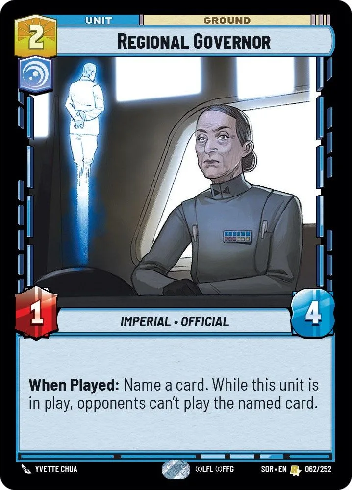 When Played: Name a card. While this unit is in play, opponents can't play the named card.