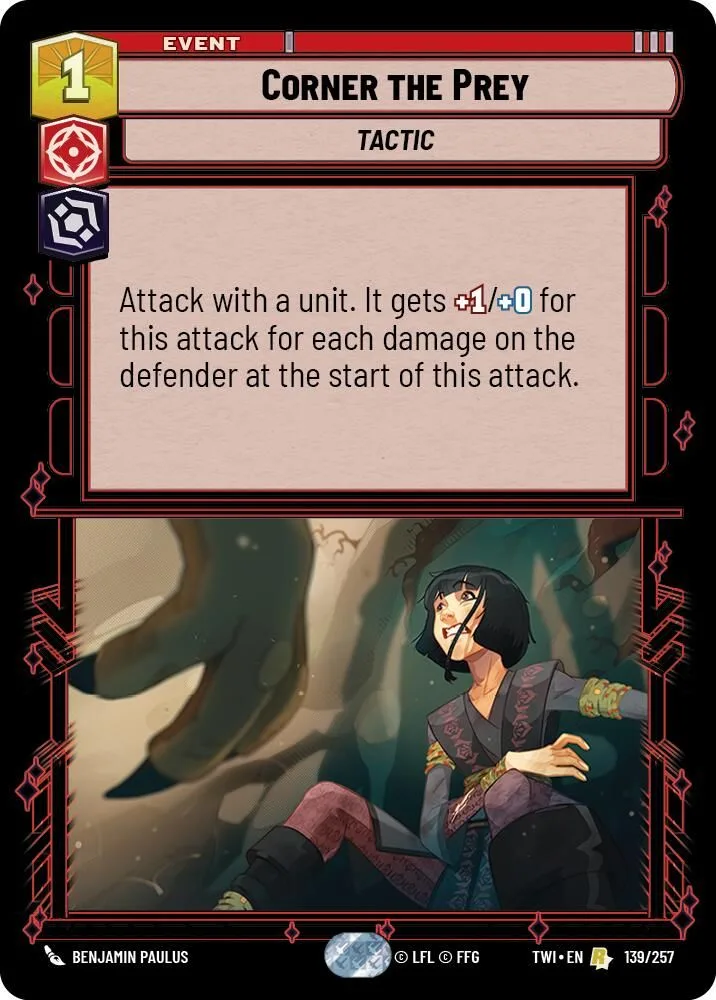 Attack with a unit. It gets +1/+0 for this attack for each damage on the defender at the start of this attack.