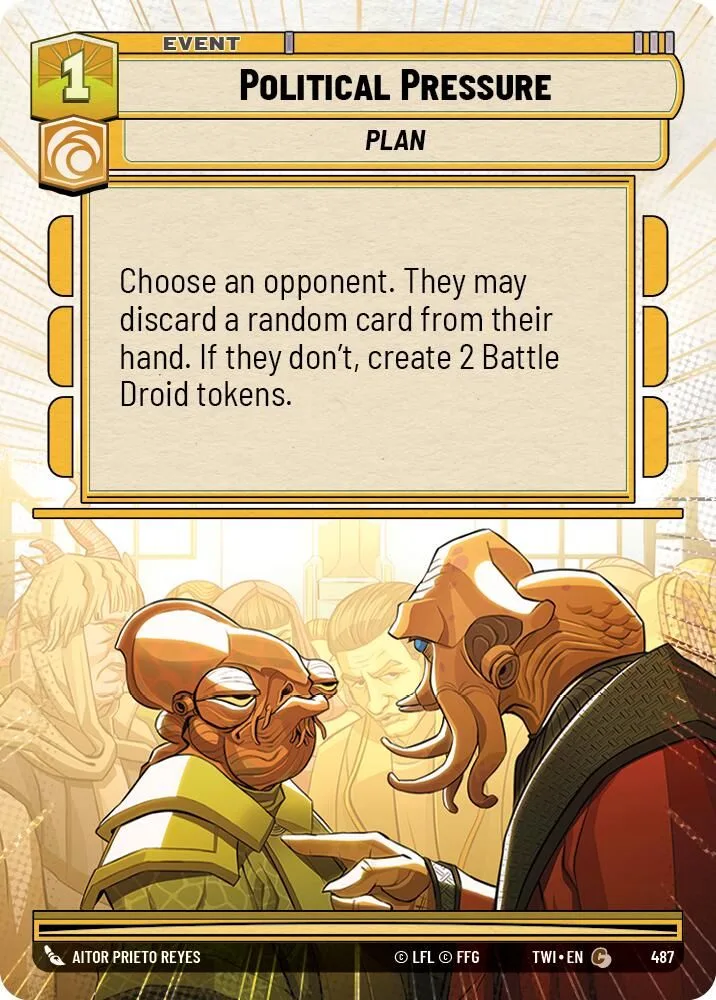 Choose an opponent. They may discard a random card from their hand. If they don’t, create 2 Battle Droid tokens.